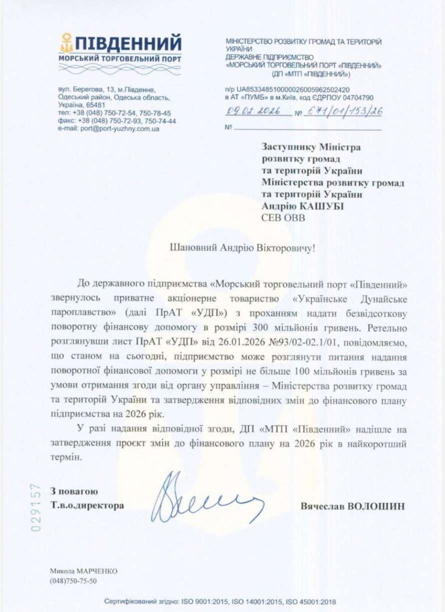 Тепер через Українське дунайське пароплавство, яке підконтрольне Міністерству інфраструктури, змушують перевести мільйони гривень на рахунки УДП для нібито виведення пароплавства з кризи.