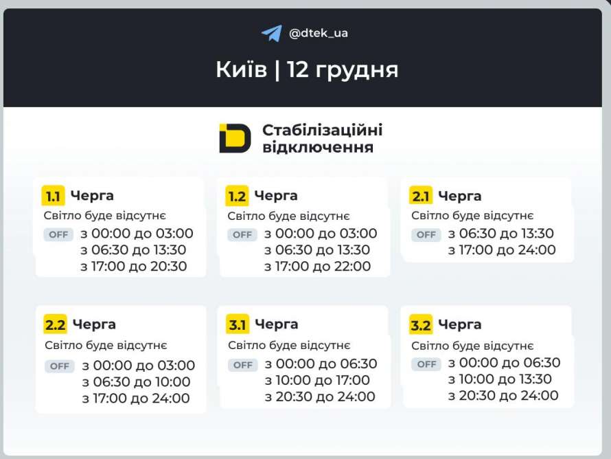 В ДТЭК обнародовали графики отключения света в Киеве завтра, 12 декабря.
